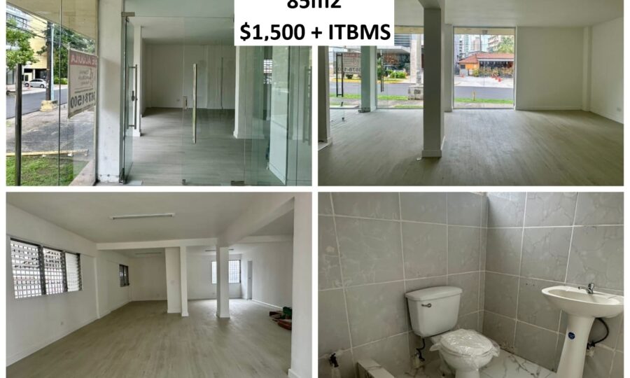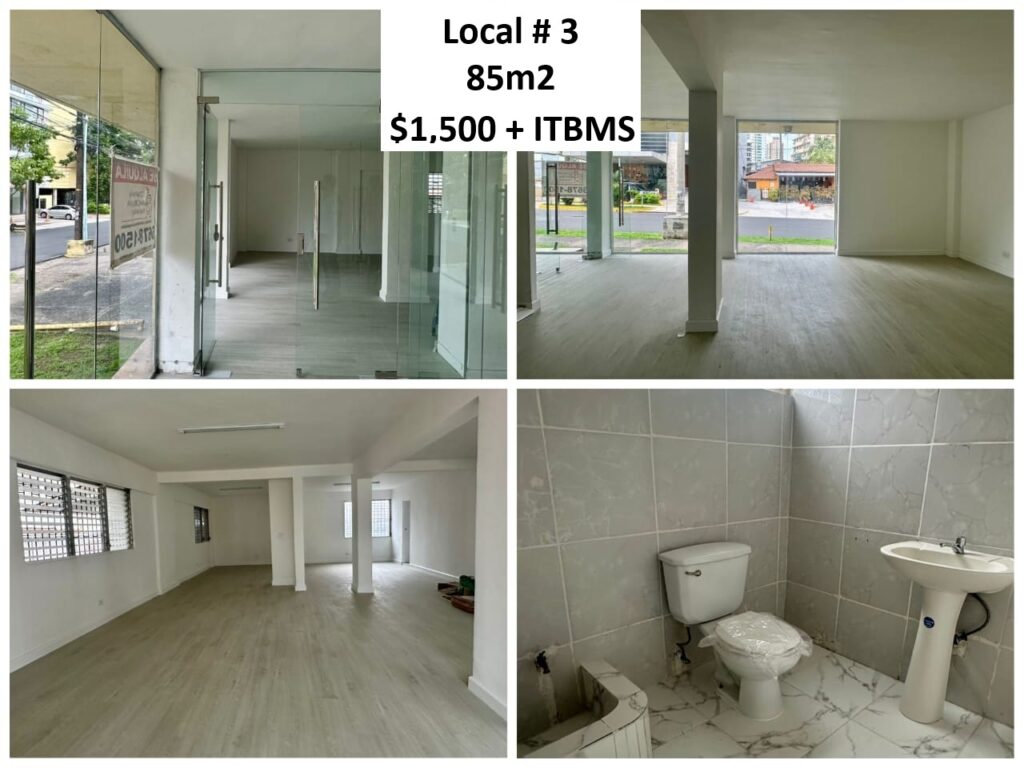 * Local # 3 cuenta con 85 m2, medio baño con tina de aseo y 1 estacionamiento- Alquiler $1,350 + ITBMS.